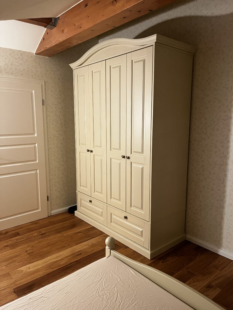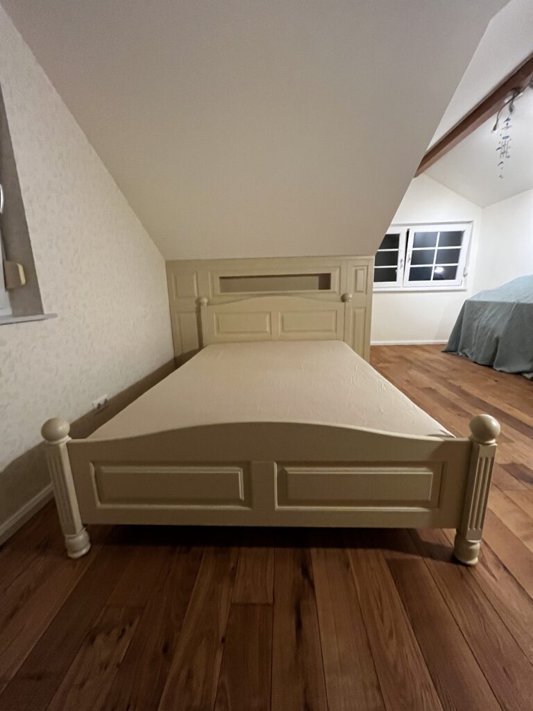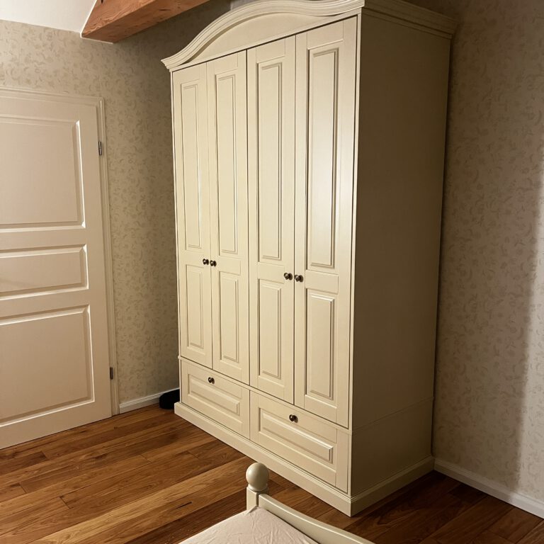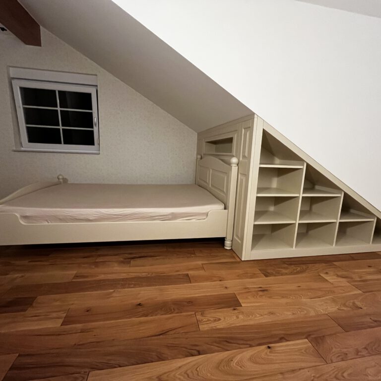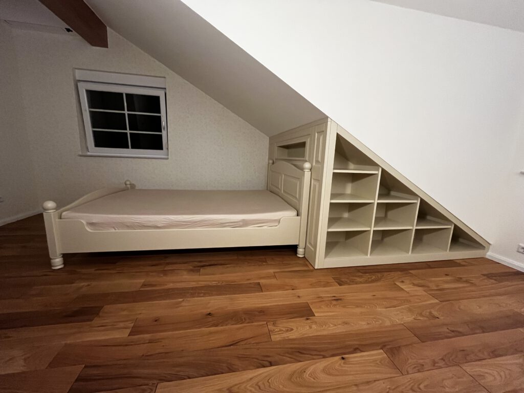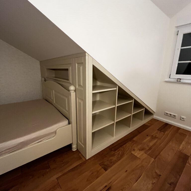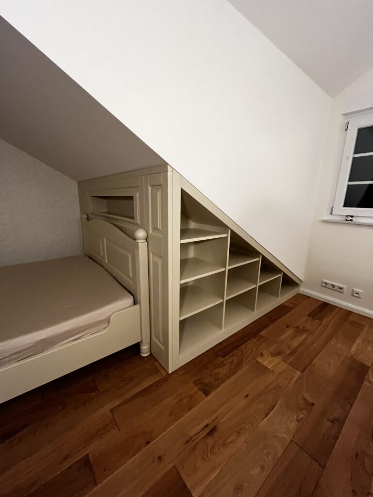 In diesem Projekt haben wir ein Zimmer im Landhausstil eingerichtet, das trotz der vorhandenen Dachschrägen harmonisch, gemütlich und praktisch gestaltet ist. Die Möbel wurden individuell an die Raummaße angepasst und farblich perfekt auf die Tapete abgestimmt, sodass ein stimmiges Gesamtbild entsteht. Jedes Detail wurde sorgfältig geplant, damit das Zimmer nicht nur schön aussieht, sondern auch komfortabel und funktional im Alltag genutzt werden kann – ideal zum Wohlfühlen.